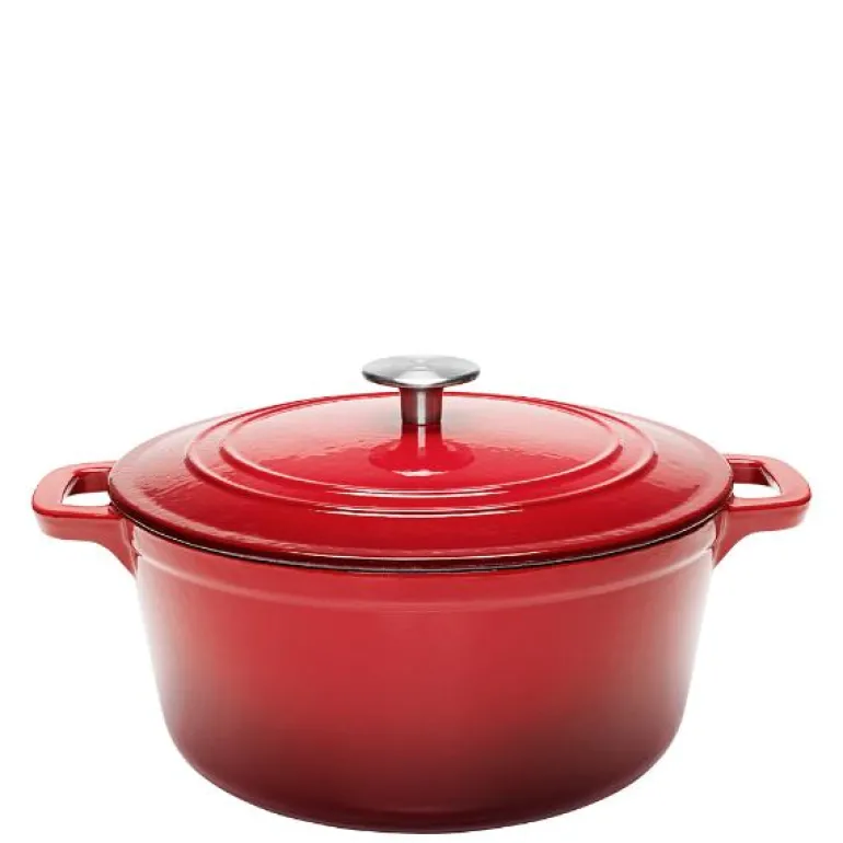 Stenfors støpejernsgryte rund 4,4L i rød er en robust gryte som passer både små og store husholdninger. Laget av emaljert støpejern, sørger gryten for jevn varmefordeling, som holder på varmen helt ut til kantene, noe som gir perfekte matlagingsresultater. Emaljen absorberer verken smak eller lukt, og den er enkel å rengjøre. Lokket er utstyrt med en knott som sørger for at kondensen renner ned i gryten igjen i stedet for å samle seg rundt kantene, noe som gir bedre smak og konsistens i rettene dine.