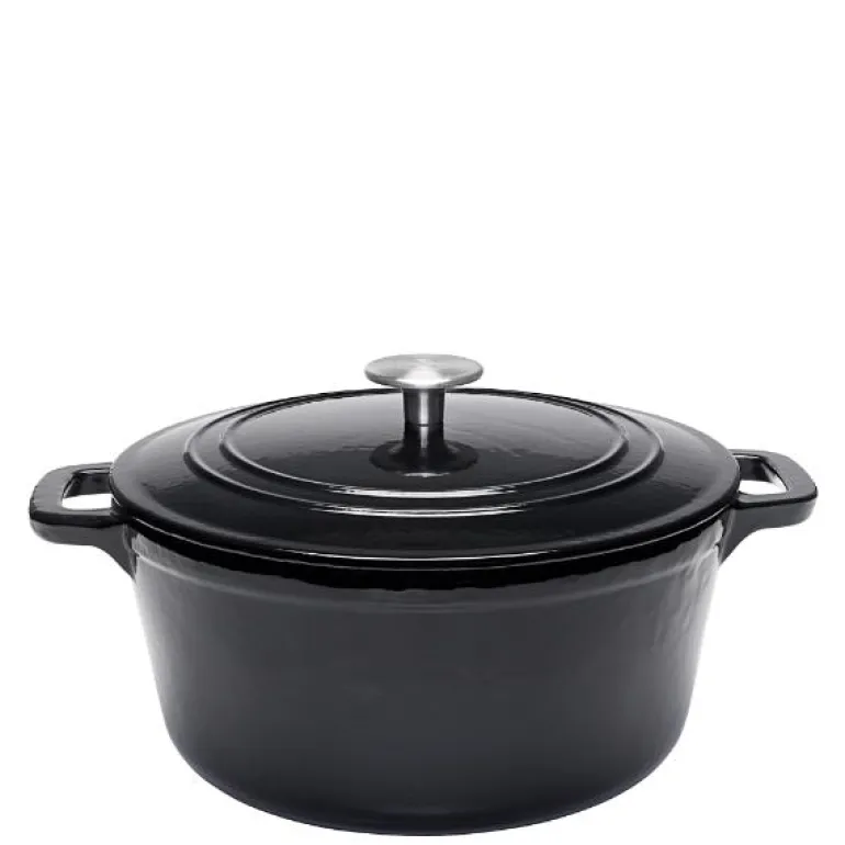 Stenfors støpejernsgryte rund 4,4L i svart er en solid og pålitelig gryte som passer for alle typer husholdninger, store som små. Gryten er laget av emaljert støpejern, som sikrer jevn varmefordeling helt ut til kantene, noe som gir perfekt matlaging hver gang. Emaljen absorberer ikke smak eller lukt og er enkel å rengjøre, noe som gjør den både praktisk og hygienisk i bruk. Lokket er utstyrt med en knott som gjør at kondens drypper tilbake i gryten, i stedet for å samle seg rundt kantene, noe som sikrer saftigere og mer smakfulle retter.
