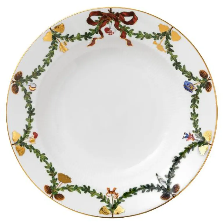 Skap julestemning ved å dekke bordet med den tidløse serien Stjerne Riflet Jul fra Royal Copenhagen. Den dype tallerkenen på 24,5 cm er pyntet med delikate kranser av gran og silkebånd, som sammen med detaljert julepynt langs kantene gir serviset et elegant uttrykk. Dette er serviset som setter rammen for et innbydende og stemningsfullt julemåltid, hvor borddekkingen blir en del av juletradisjonen og atmosfæren stiger med tent lys.
