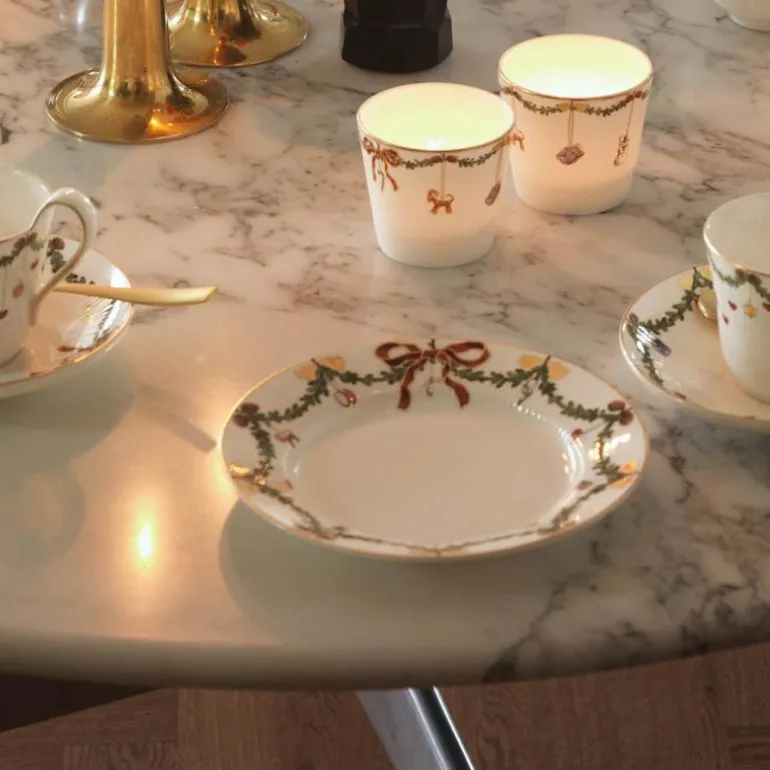 Å dekke bordet med juleservise fra Royal Copenhagen er en av mange juletradisjoner. De dekorative kransene av gran, prydet med silkebånd og julepynt rundt kantene på tallerknene, skålene og koppene, skaper et rikt og elegant servise som danner den perfekte ramme for et hyggelig julemåltid. Julen er her når bordet er dekket og lysene er tent.