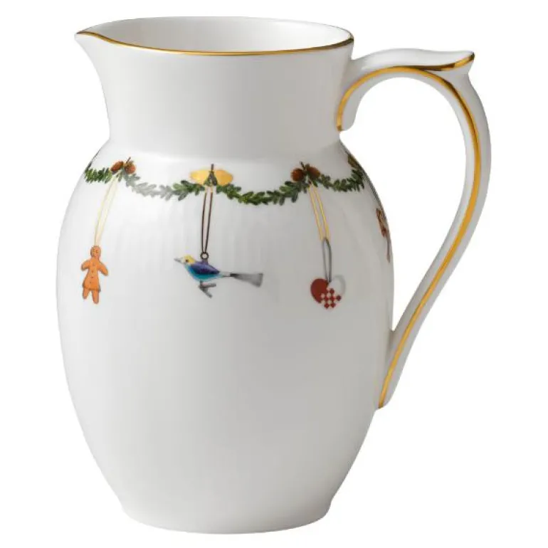 Stjerne Riflet Jul kanne på 0,9 liter fra Royal Copenhagen er et raffinert tillegg til julebordet, perfekt for å servere melk, saft eller andre drikker som kompletterer julens måltider. Denne kannen er en del av det tidløse Stjerne Riflet Jul-serviset, kjent for sine vakre håndmalte kranser av gran og silkebånd, som gir borddekkingen en tradisjonell og høytidelig atmosfære. Kannen tilfører bordet en sjarmerende detalj som gjør hvert måltid litt mer spesielt.