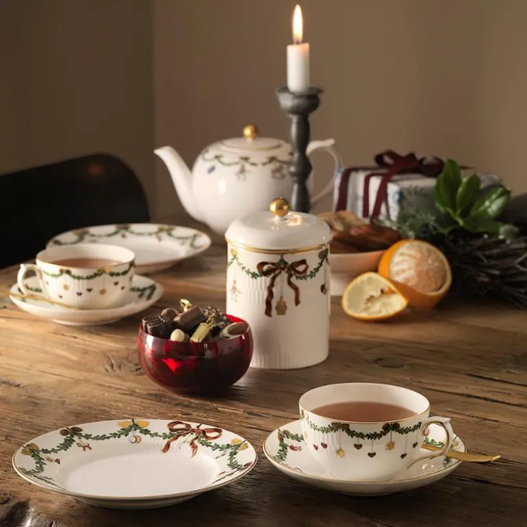 Å dekke bordet med juleservise fra Royal Copenhagen er en av mange juletradisjoner. De dekorative kransene av gran, prydet med silkebånd og julepynt rundt kantene på tallerknene, skålene og koppene, skaper et rikt og elegant servise som danner den perfekte ramme for et hyggelig julemåltid. Julen er her når bordet er dekket og lysene er tent.