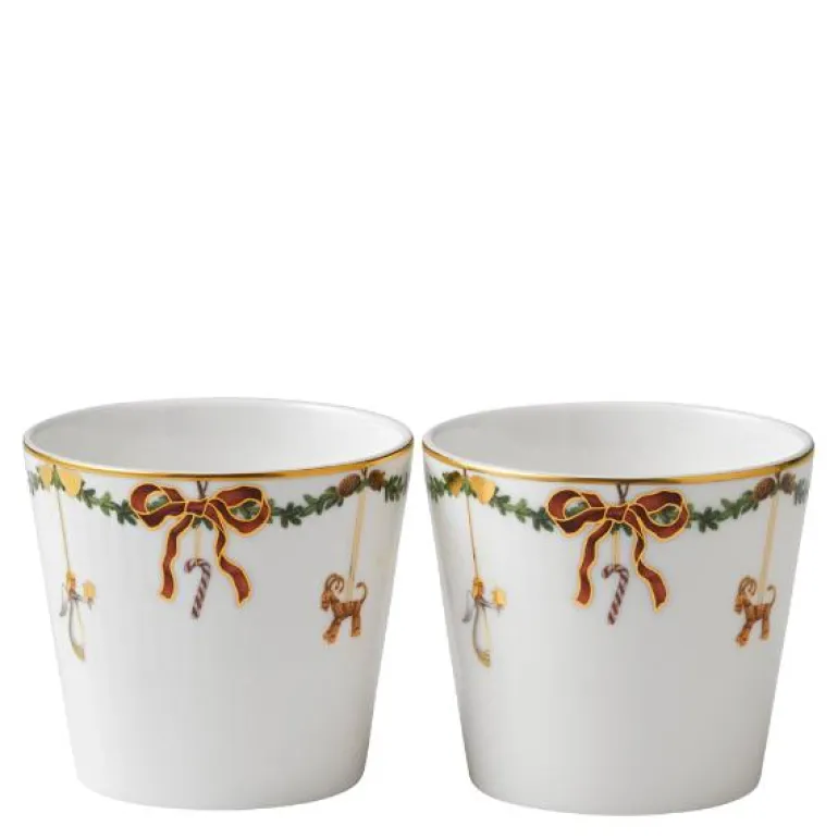 Hver kopp er laget i benporselen og håndmalt i fargene hvit, gull, grønn og rød, inspirert av en designtradisjon som strekker seg tilbake til 1895. Med en høyde på 7 cm og en diameter på 8 cm, er koppene både praktiske og elegante. De tåler oppvaskmaskin, så de er enkle å bruke og vedlikeholde i en travel juletid. Denne 2-pakningen fra Royal Copenhagen tilfører julens feiringer en unik kombinasjon av tradisjon og skjønnhet – et ideelt valg for dem som ønsker å dekke bordet med stil og historie.