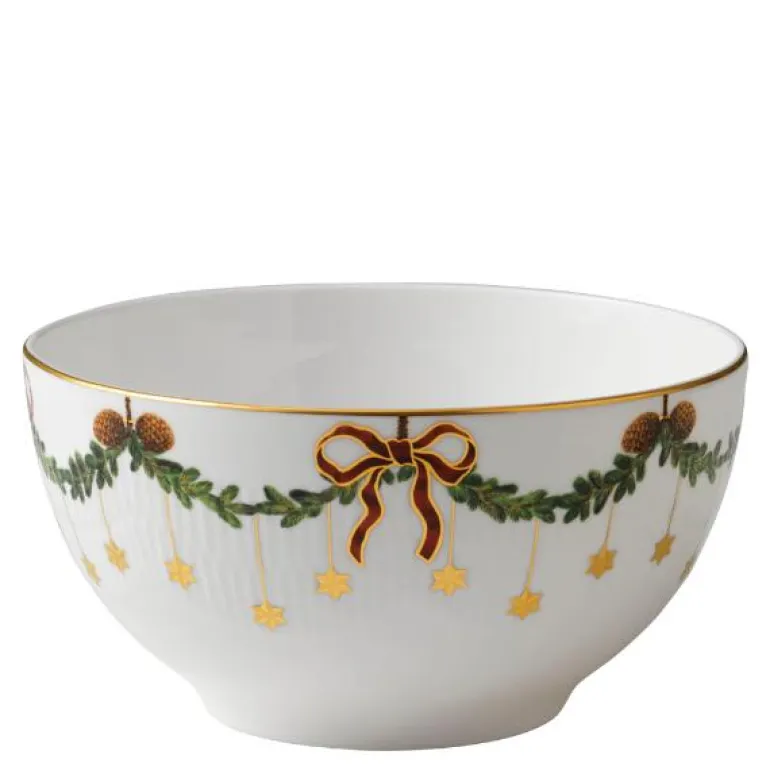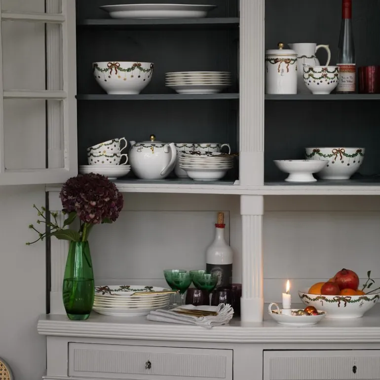 Stjerne Riflet Jul, med sine ikoniske kranser av gran og røde silkebånd, har blitt en tidløs klassiker fra Royal Copenhagen som setter en elegant ramme rundt julebordet. Inspirert av en designserie som først ble produsert i 1895, bringer dette serviset tradisjon og høytid til borddekkingen, og er elsket av julefeirere verden over. De håndmalte detaljene i hvitt, gull, grønt og rødt gir serviset en sofistikert og festlig glød som løfter stemningen under alle julens måltider.