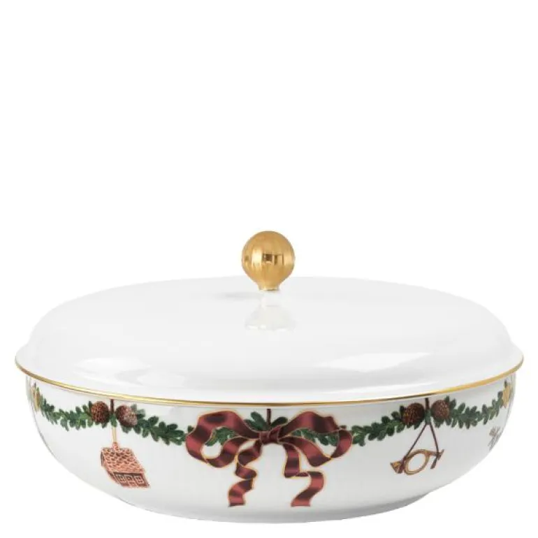 Denne skålen med lokk er en del av den populære Stjerne Riflet Jul-serien, som har blitt en kjær tradisjon for mange familier. Det vakre håndverket og de klassiske detaljene i serviset gir borddekkingen en sofistikert ramme, perfekt for å skape minneverdige måltider fylt med glede og samvær.