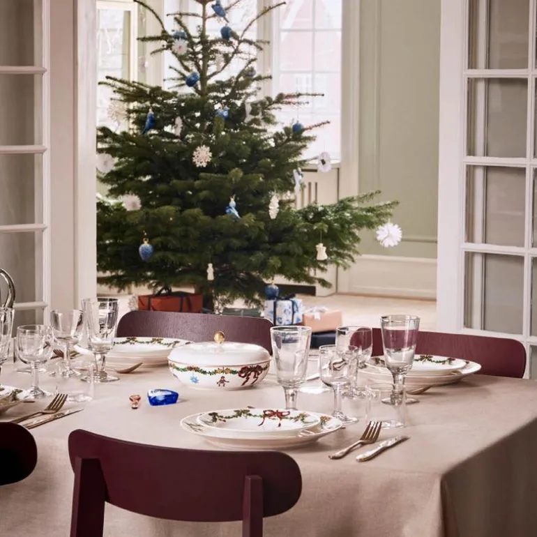 Stjerne Riflet Jul skål med lokk fra Royal Copenhagen er et utsøkt og funksjonelt element til julebordet, ideelt for å servere og holde juletidens delikate retter varme. Dekorert med de karakteristiske kransene av gran, silkebånd og julepynt, tilfører denne skålen en tidløs eleganse som forsterker julestemningen ved bordet. Når den ikke er i bruk, fungerer skålen som et dekorativt midtpunkt og tilfører en festlig atmosfære til ethvert rom.