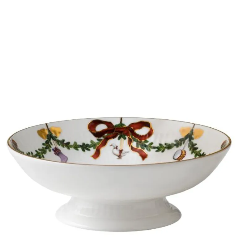 Stjerne Riflet Jul skål på fot, med en diameter på 18 cm, fra Royal Copenhagen tilfører julebordet en klassisk eleganse og feststemning. Denne dekorative skålen, prydet med de karakteristiske kransene av gran og silkebånd, gir borddekkingen et rikt og innbydende uttrykk som er perfekt for julens mange måltider og samlinger. Plassert på fot, løftes skålen fram som et blikkfang og gir ekstra høytid til serveringen av både frukt, søtsaker og annen julegodt.