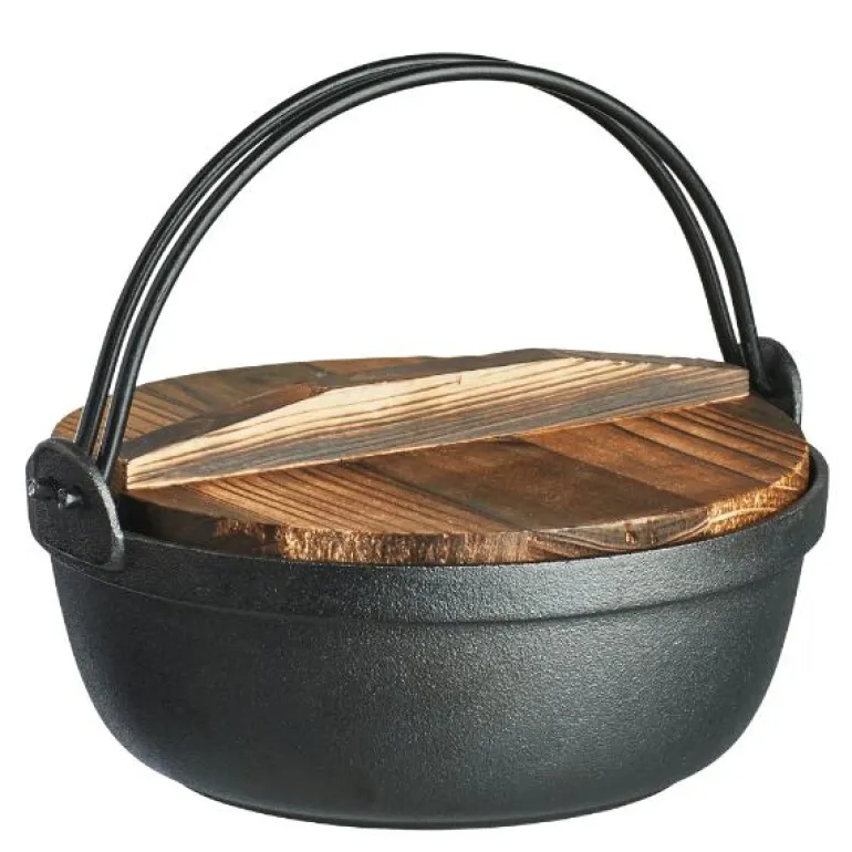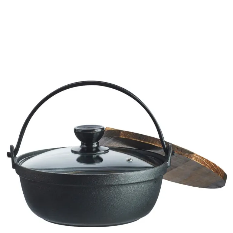 Støpejernsgryte med glasslokk og trelokk fra Satake.