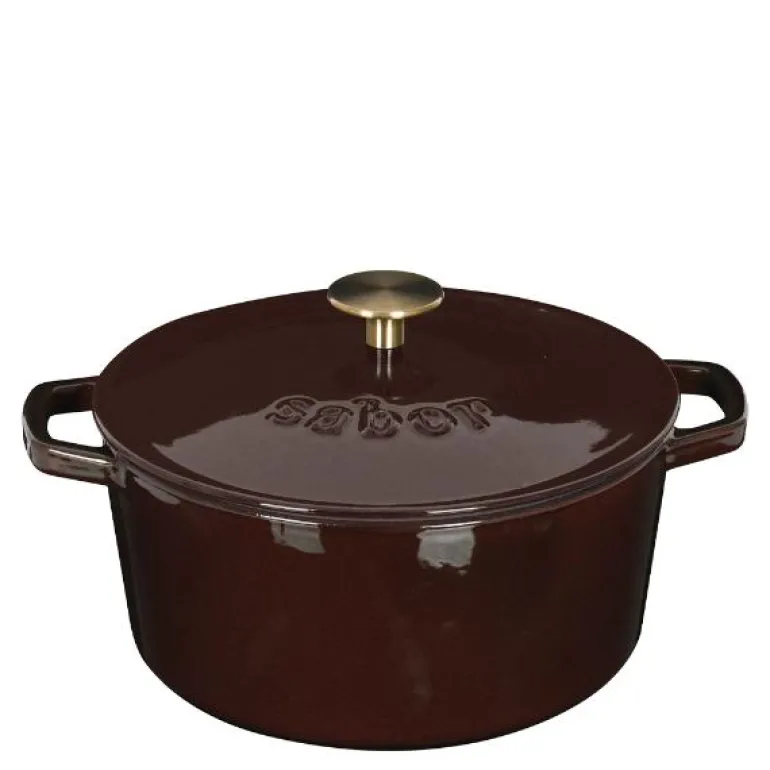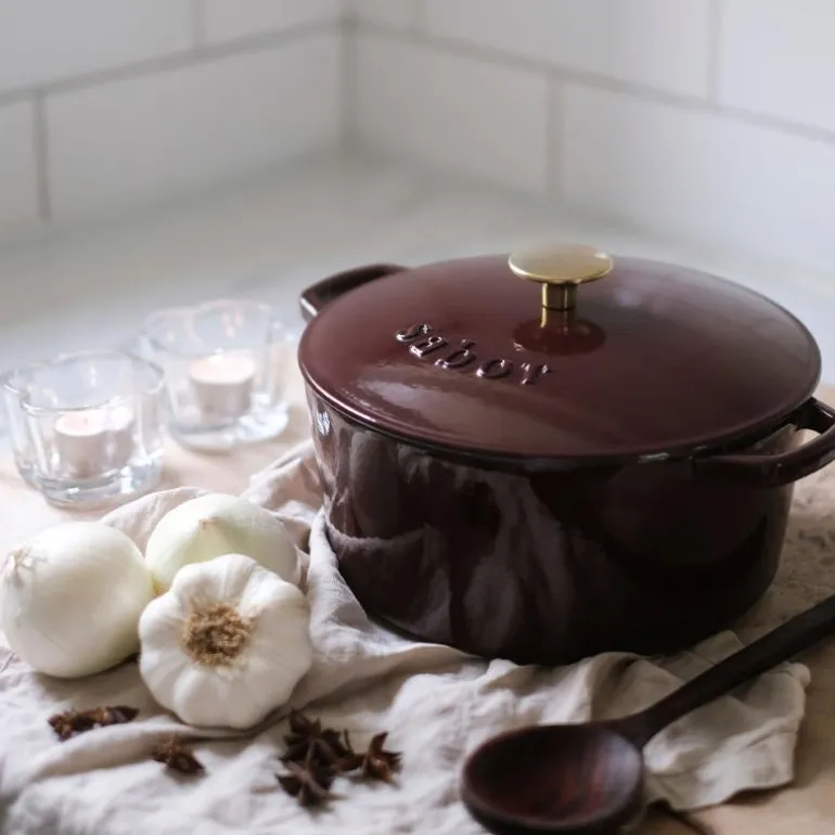 Støpejernsgryte i lekker zinfandel farge, fra Sabor. Gryten rommer 4,4 liter, og er toppet med gullfarget knott.