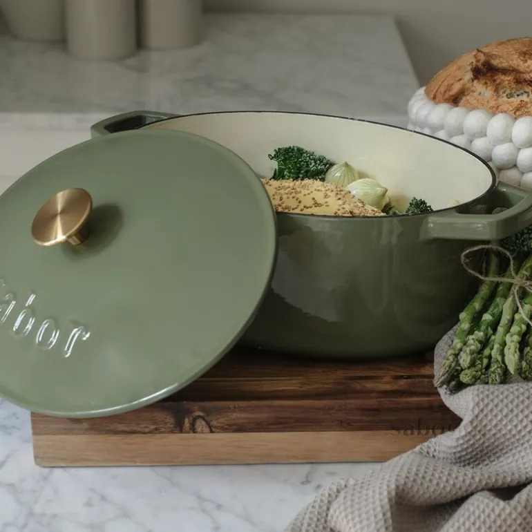 Denne elegante støpejernsgryten fra Sabor, med en kapasitet på 5,7 liter og en vakker olivenfarge, kombinerer tidløs design med enestående funksjonalitet. Grytens robuste konstruksjon sikrer at den kan gå i arv gjennom generasjoner, mens dens evne til å holde og fordele varmen jevnt gjør den til et uunnværlig verktøy på kjøkkenet. Med denne gryten kan du ofte redusere varmen på platen betraktelig, noe som gir både energibesparelser og jevn matlaging.