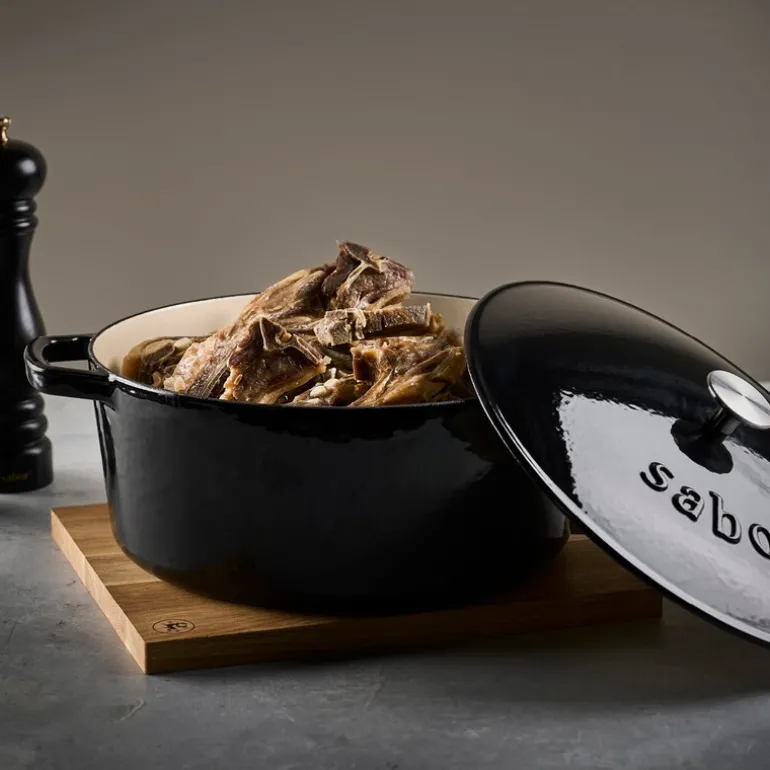 Sabor støpejernsgryte på 9,5 liter i elegant svart er et perfekt valg for den som ønsker et kraftig og pålitelig kjøkkenredskap. Denne gryten gir utmerket varmefordeling og holder lenge på temperaturen, slik at du kan lage gryteretter, steker og langtidskokt mat med optimal resultat. Gryten er også ideell for «no-knead bread» – bare sett deigen i gryten, og la den steke i ovnen for et luftig og sprøtt brød.