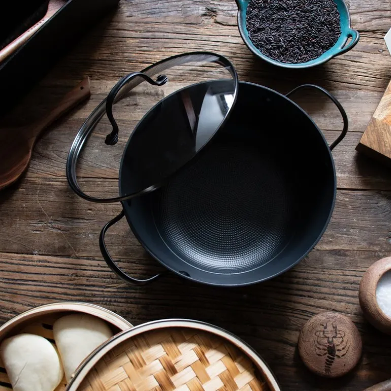 Den unike honeycomb-strukturen i kasserollen sikrer optimal varmefordeling, noe som gir en jevn og kontrollert temperatur for alt fra småkoking til mer intensiv matlaging. I tillegg får du en vakker og sprø stekeskorpe på ingrediensene dine takket være den innovative overflaten. Med de matt svarte håndtakene og detaljene på både kasserollen og glasslokket, tilfører den et sofistikert preg til kjøkkenet ditt – en kombinasjon av funksjonalitet og estetikk som er vanskelig å slå.