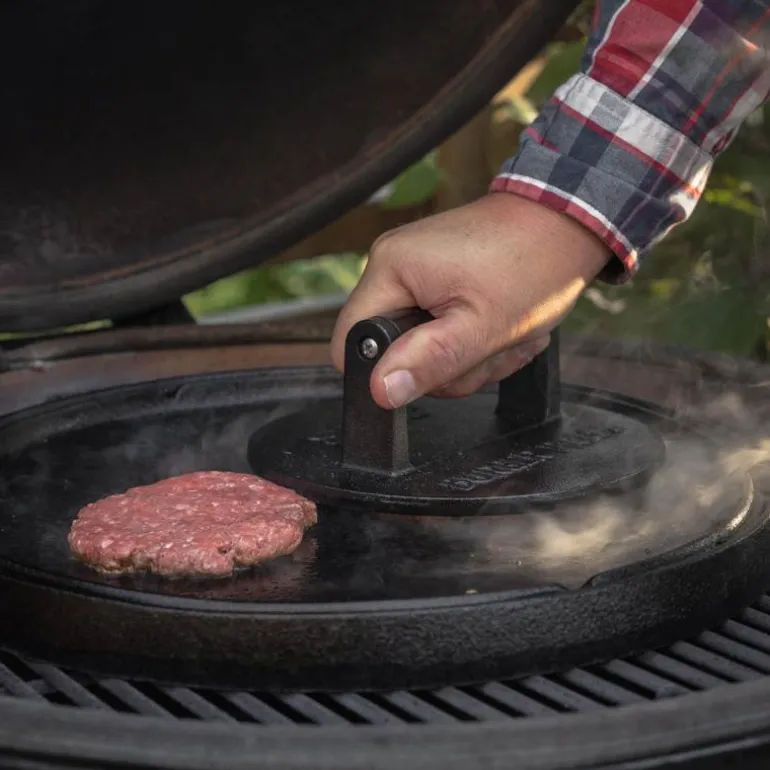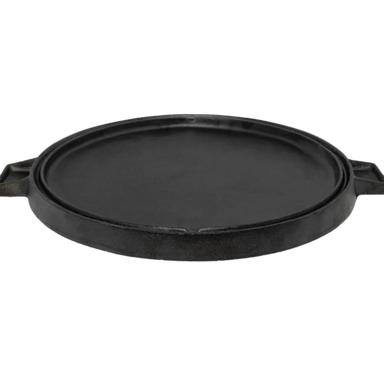 Dobbeltsidig grill og stekepanne i støpejern, rund med diameter 36cm. Den ene siden er ribbet som en grillplate for riktig grillmønster på steken. Snu støpejernet og bruk det som stekeplate.