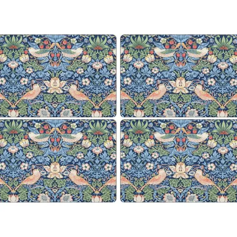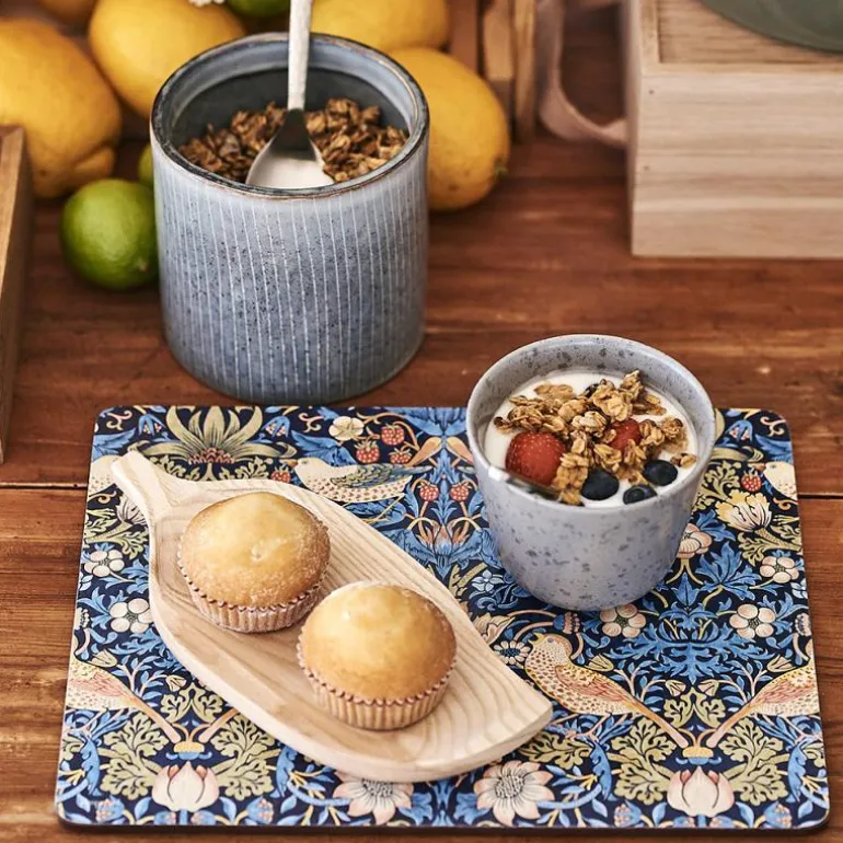 Fargeglad bordbrikke fra Pimpernel i samarbeid med Morris & Co, til frokost på sengen eller ettermiddagskaffe. Motivet Strawberry Thief tilfører det lille ekstra til dekkingen og forestiller en jordbærsugen fugl blant blomster og blad.Bordbrikken er laget av et uovertruffet lagsystem med korkbase, hardved i midten, fantastisk design og avsluttes med en beskyttende og slitesterk film. Den varmebestandige overflaten tåler temperaturer opp til 100 °C. Selges i 4-pakning.William Morris (år 1834-1896) var en kunstner, filosof og politisk tenker, men også en enestående og innflytelsesrik designer, som gjennom sitt foretak Morris & Co kunne designe tidenes mest moteriktige og spennende tapeter og tøy.