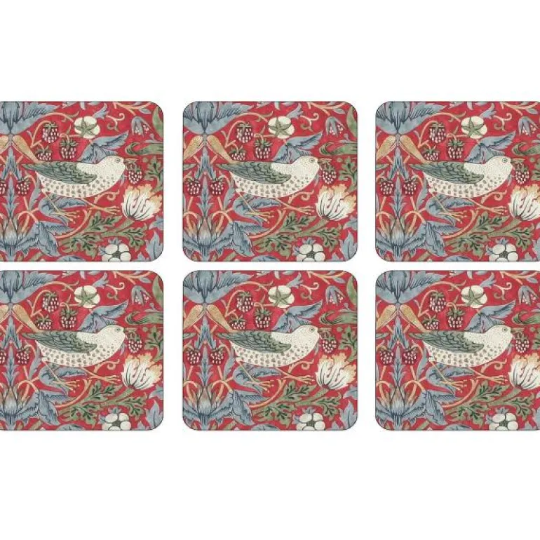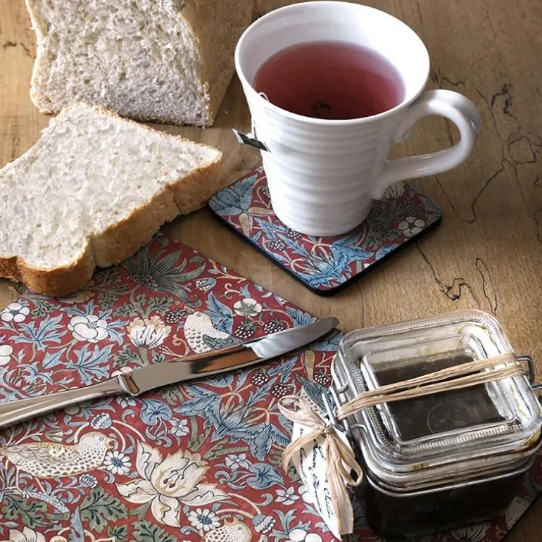 Fargeglad glassbrikke fra Pimpernel i samarbeid med Morris & Co, til frokost på sengen eller ettermiddagskaffe. Motivet Strawberry Thief tilfører det lille ekstra til dekkingen og forestiller en jordbærsugen fugl blant blomster og blad.Underläggen er laget av en uovertruffet lagsystem med korkbase, hardved i midten, fantastisk design og avsluttes med en beskyttende og slitesterk film. Den värmetåliga ytan tåler temperaturer opp til 100 °C. Selges i 6-pakning.William Morris (år 1834-1896) var en kunstner, filosof og politisk tenker, men også en enestående og innflytelsesrik designer, som gjennom sitt foretak Morris & Co kunne designe tidenes mest moteriktige og spennende tapeter og tøy.