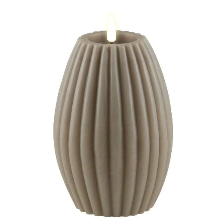 Stripe LED kubbelys 15x10cm i fargen sand. Deluxe LED lys med oval form og striper i en nydelig sand farge. Lyset er naturtro, med sin unike flamme. Led lyset har timerfunksjon på 2, 4, 6, 8 timer. For innendørs bruk. Kubbelyset bruker 2xAA batterier og estimert brennetid er ca.400 timer.