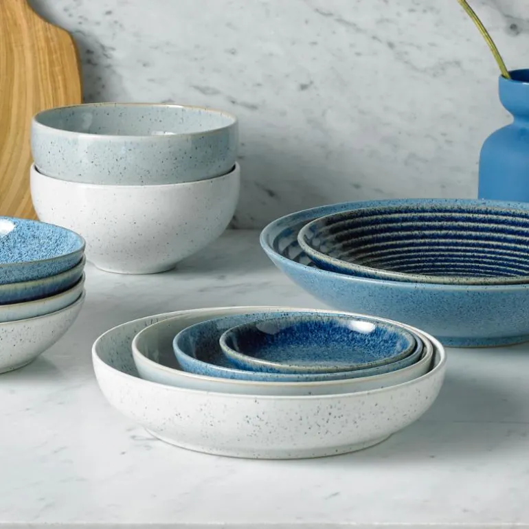 Denbys Studio Blue kommer fra den lyseste dueblå til mørkeste mørkeblå – og alle nyanser i mellom. Blåtonene er like enkle å matche og like tidløse som de er stilige. Man får ikke for mye av det blå og du kan utmerket blande de ulike blåtonene på Denby’s tallerkener, serveringsfat og skåler for å gi spisebordet en dypere bredde som skaper en ny dimensjon til en ellers tradisjonell borddekking.