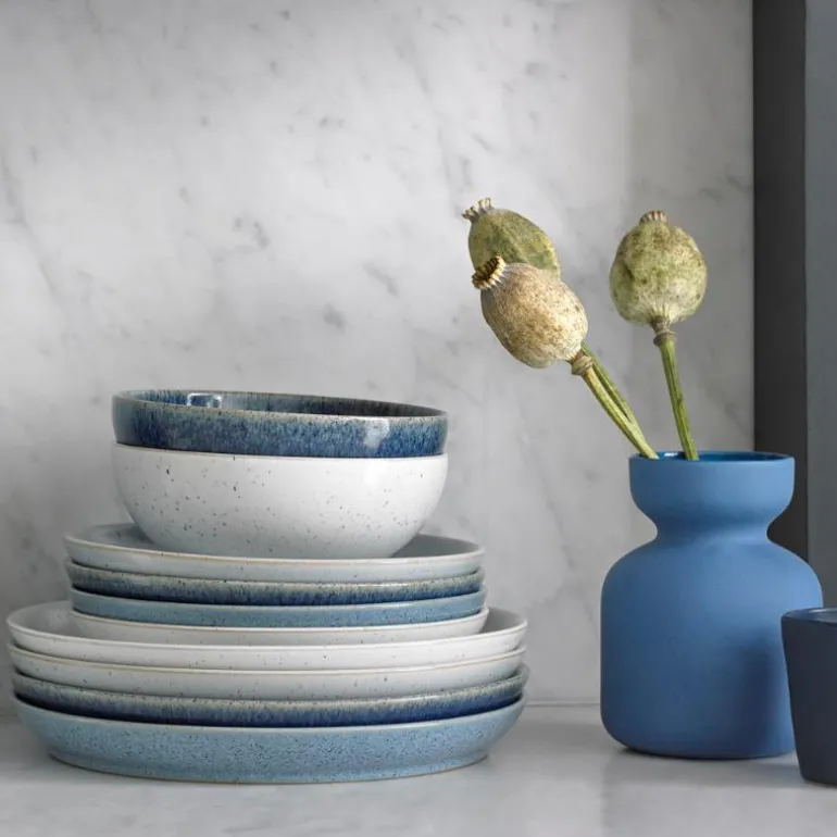 Denbys Studio Blue kommer fra den lyseste dueblå til mørkeste mørkeblå – og alle nyanser i mellom. Blåtonene er like enkle å matche og like tidløse som de er stilige. Man får ikke for mye av det blå og du kan utmerket blande de ulike blåtonene på tallerkener, serveringsfat og skåler for å gi spisebordet en dypere bredde som skaper en ny dimensjon til en ellers tradisjonell borddekking.