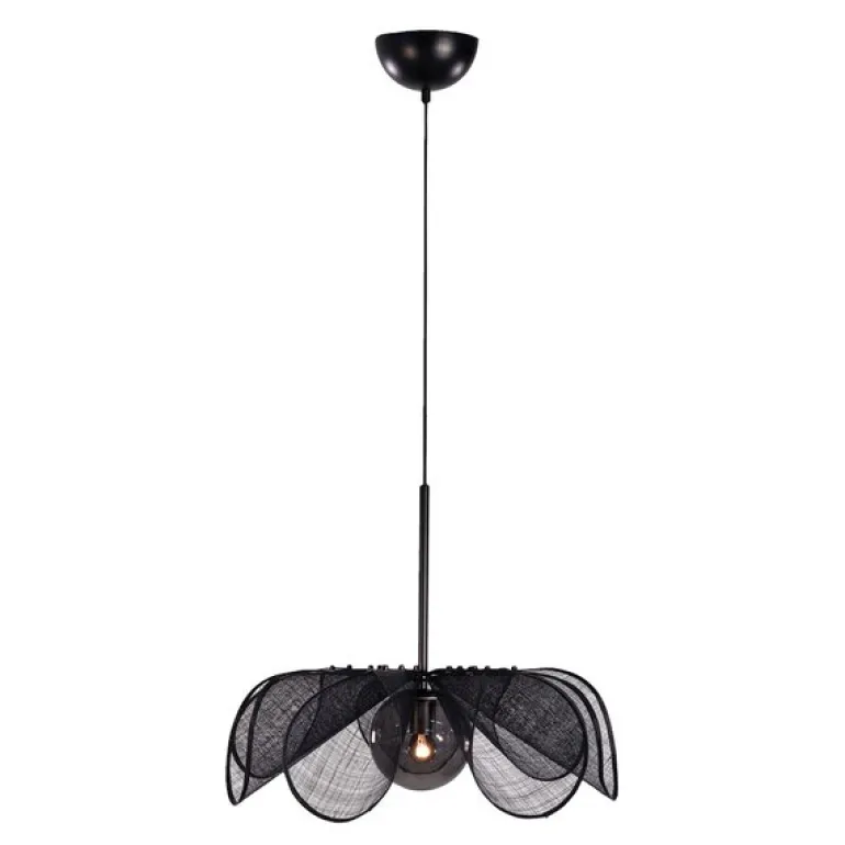Med Styrka taklampe 63 cm svart fra Markslöjd får du et slående designelement som skaper en elegant atmosfære i ethvert rom. Den store lampen, med en diameter på 63 cm, har et blomst-inspirert design med skjermene laget av bananfiber, formet som delikate kronblader. Disse omkranser et røykfarget glass som gir et mykt og behagelig lys fra lyskilden inne i glasset.