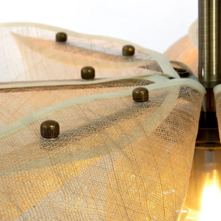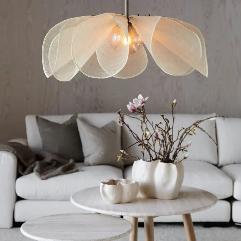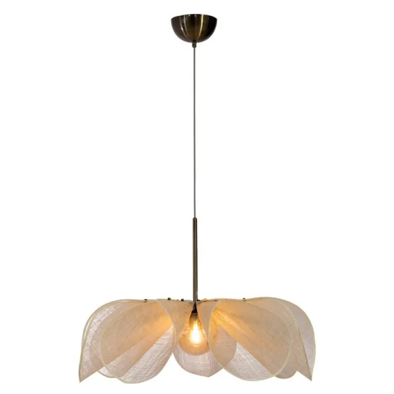 Hvert kronblad er festet med to antikke messingmuttere som gir en fin kontrast til de lette, gjennomsiktige skjermene, som har en tekstur som minner om lin. Denne kombinasjonen av materialer gir lampen et sofistikert uttrykk. I tillegg er den beige tekstilkabelen og takkoppen i antikk messing detaljer som fullfører lampens moderne og stilrene design. Styrka taklampe finnes også i flere farger og i en mindre størrelse, slik at du kan finne den perfekte versjonen for ditt hjem.