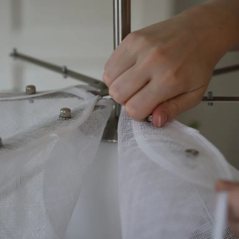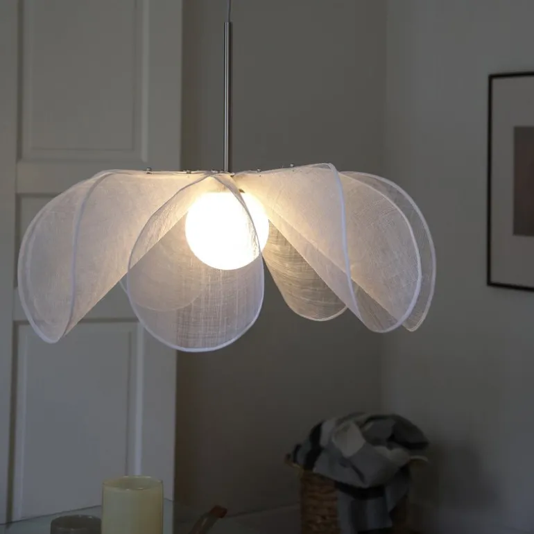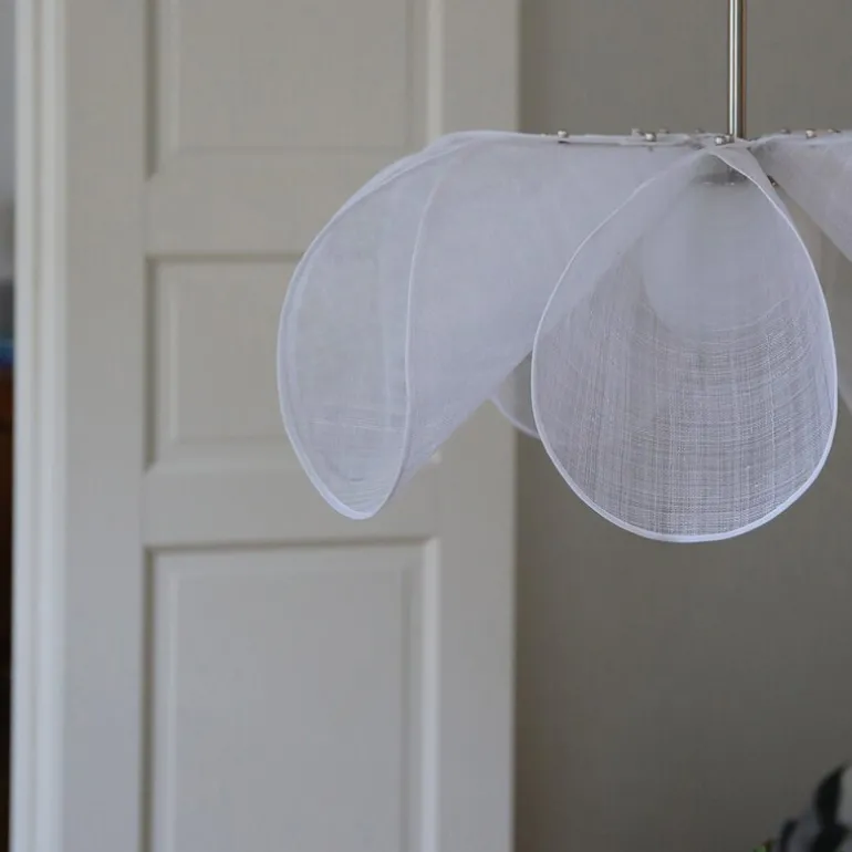 Hvert kronblad er festet med to elegante muttere i nikkel som gir en fin kontrast til de lette, gjennomsiktige skjermene, som har en tekstur som minner om lin. Denne kombinasjonen av materialer gir lampen et sofistikert uttrykk. I tillegg er den grå tekstilkabelen og takkoppen i nikkel detaljer som fullfører lampens moderne og stilrene design. Styrka taklampe finnes også i flere farger og i en mindre størrelse, slik at du kan finne den perfekte versjonen for ditt hjem.