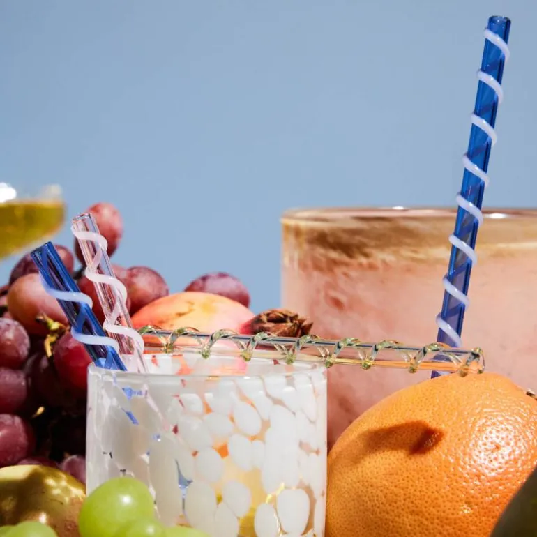 Korte sugerør i glass med snirklete mønster i forskjellige farger. Et alternativ når du vil gjøre hvert drikkeglass ekstra festlig. 4 stk pakket i Byonbox. Perfekt liten gave. Tåler vask i oppvaskmaskin.