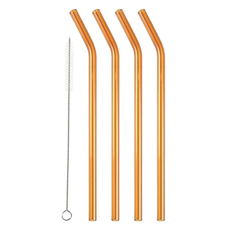 4 stk sugerør med knekk i glass på 21,5 cm i den vakre fargen amber fra Lyngby Glas er et elegant og praktisk alternativ til plast, da de kan brukes igjen og igjen. Settet inneholder fire gjenbrukbare sugerør laget av slitesterkt borosilikatglass, som tåler både kalde og varme drikker.