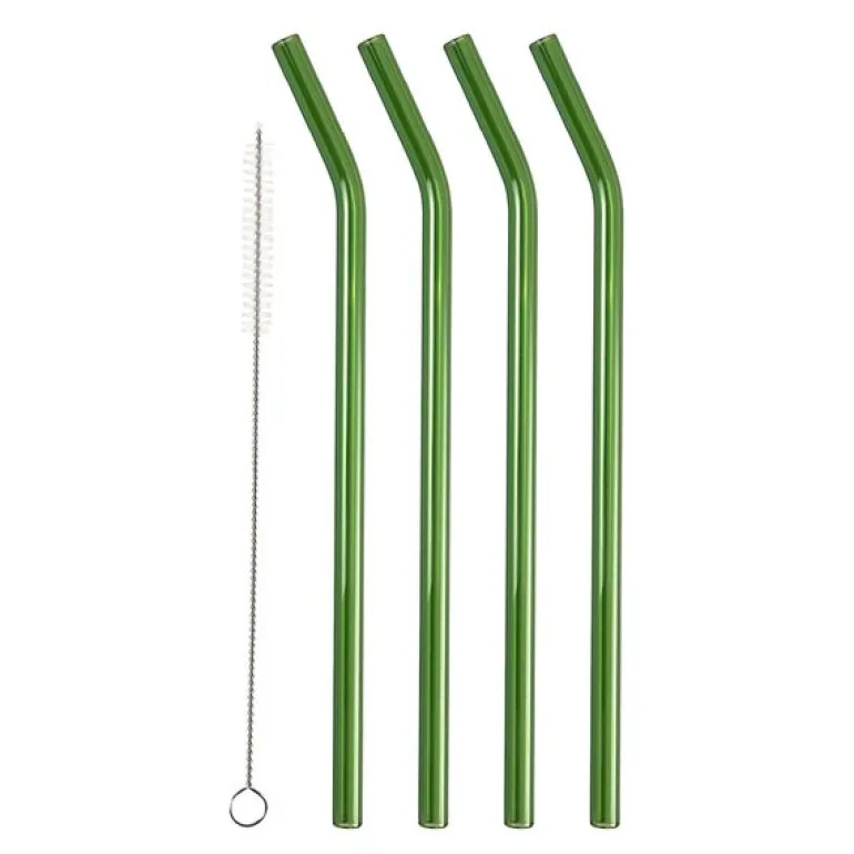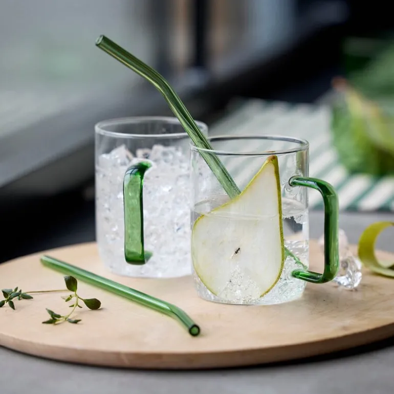4 stk sugerør med knekk i glass på 21,5 cm i en vakker grønnfarge fra Lyngby Glas er et elegant og praktisk alternativ til plast, da de kan brukes igjen og igjen. Settet inneholder fire gjenbrukbare sugerør laget av slitesterkt borosilikatglass, som tåler både kalde og varme drikker.