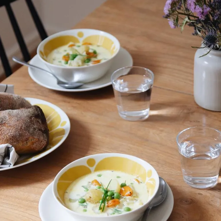 Sunnuntai plate 17cm deep. Den dype Sunnuntai-tallerkenen er laget for glade morgener: frokostblanding, grøt eller yoghurt. De forhøyede kantene gjør tallerkenen perfekt for skje. Formen egner seg spesielt godt til varme retter. Mønsteret, designet av Birger Kaipiainen, kommer til live i de tidløse formene. Delene i Sunnuntai-serien setter farge på borddekkingen.