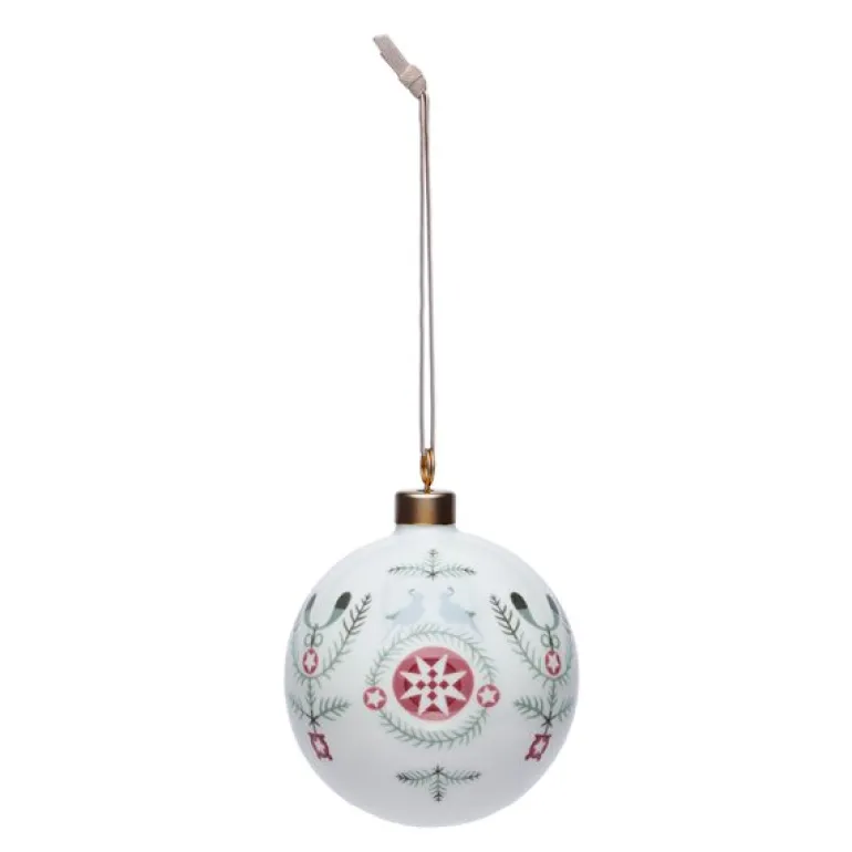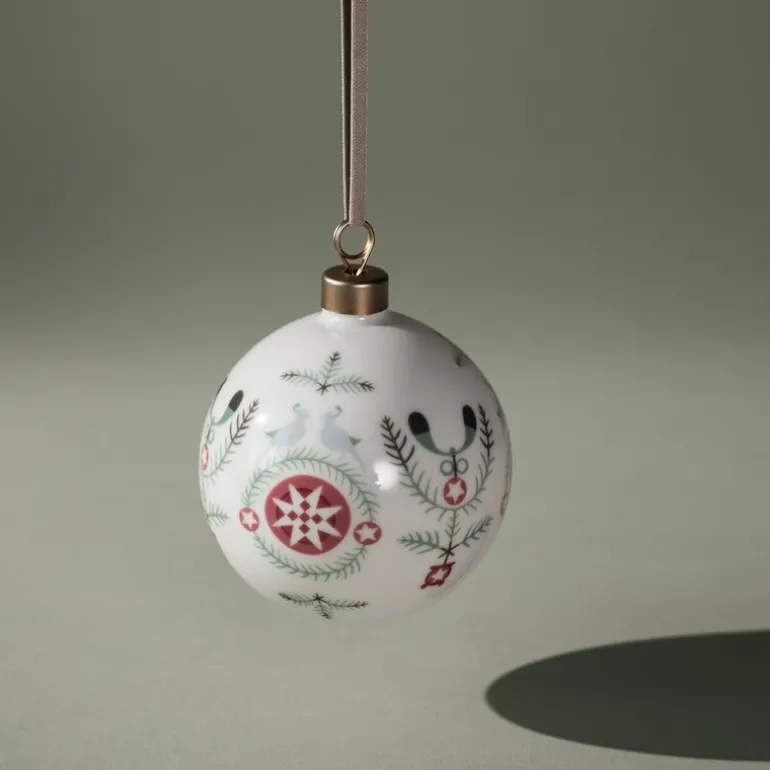 Swedish Grace Winter julekule 8 cm fra Rörstrand. Denne vakre 8 cm julekulen fra Rörstrand er dekorert med granbar, misteltein og snøflak. Designet av Katarina Brieditis, en moderne tolkning av Louise Adelborgs klassiske Swedish Grace. Skaper julemagi og en koselig atmosfære med porselensdesign. Perfekt gave for å forsterke gode juletradisjoner.