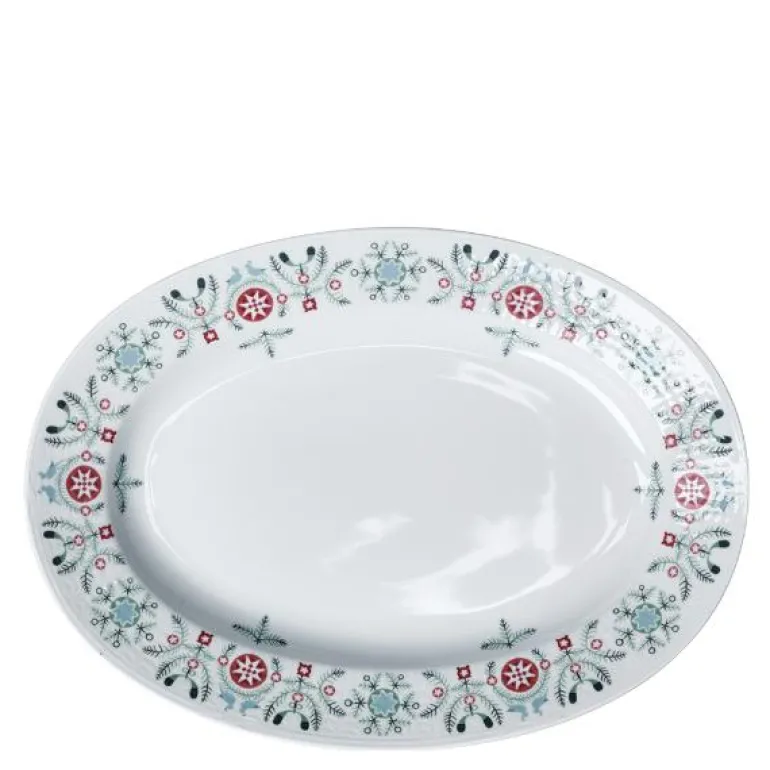 Swedish grace Vinter ovalt fat 32cm. Det ovale fatet fra Swedish Grace Vinter er det nostalgiske valget for servering av matretter ved festlige anledninger og mer. Fungerer hver for seg og i kombinasjon med deler fra det originale Swedish Grace-serviset, og bidrar med farge og lekenhet på bordet. En hyllest til vinteren, tradisjoner og barndomsminner. Kan vaskes i oppvaskmaskin.