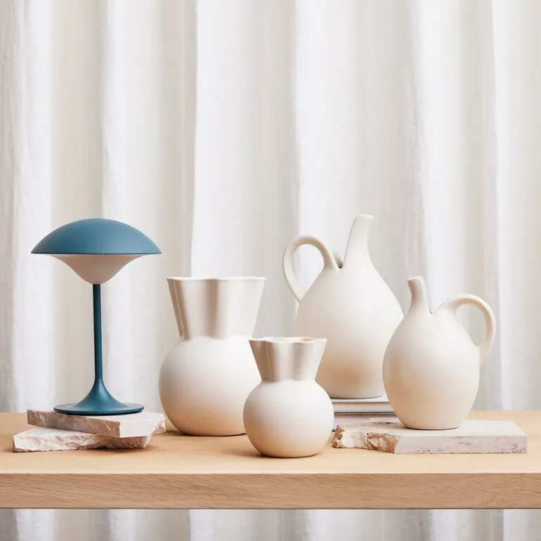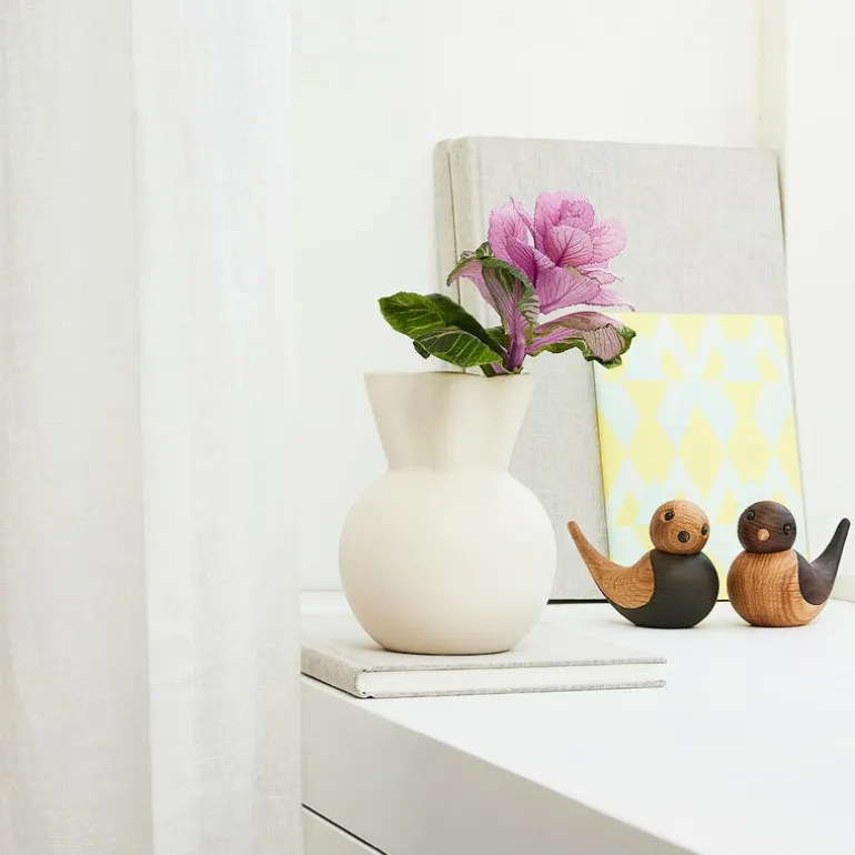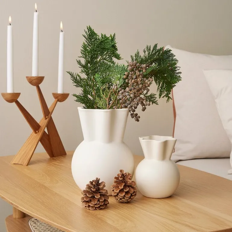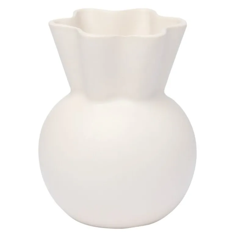 Sweeping Top vase svungen 14 cm hvit fra Spring Copenhagen. Eva Stæhr-Nielsens vase med bølget topp er gjort om til små unike varianter i hvitt, lysegrønt og støvete grønt. Med en høyde på 14 cm er den en perfekt vase for små blomsterbuketter fra barna, hagen eller skogen. Som ensemble ser disse vasene vakre ut i en bokhylle eller vinduskarm, og er et nydelig vitnesbyrd om Eva Stæhr-Nielsens særegne arv.