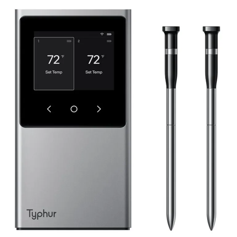 Typhur Sync Dual er et avansert trådløst steketermometer designet for presis temperaturmåling og praktisk bruk. Med sin imponerende rekkevidde, innovative design og brukervennlige funksjoner, er det perfekt for både amatører og profesjonelle kokker.