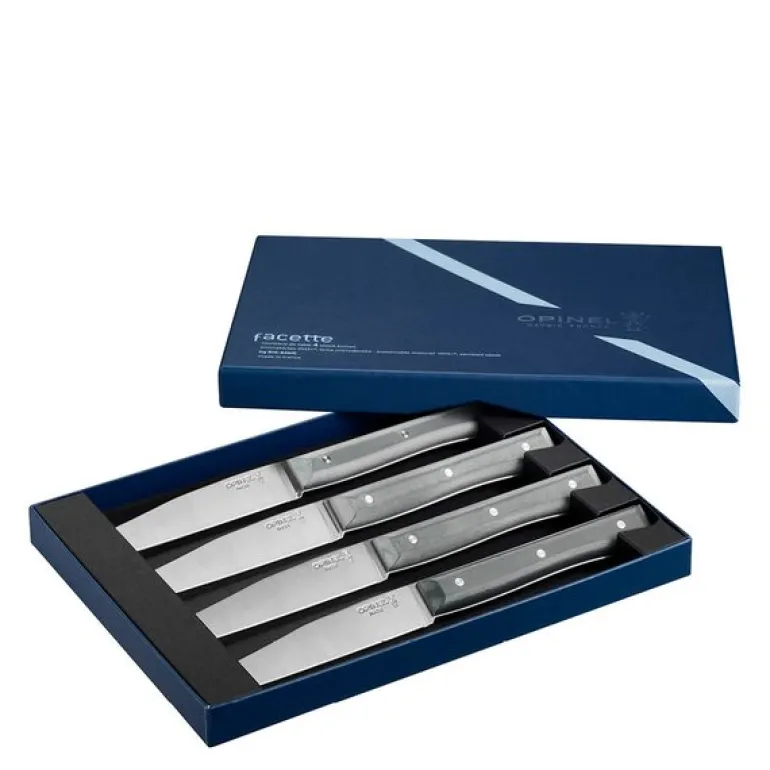 Table Bois bestikksett 4 deler Facette mikrotannet grå fra Opinel kombinerer bistro-chic design med moderne funksjonalitet. Settet inneholder fire bordkniver med mikrotannede fulltang-blader i rustfritt stål, utformet i klassisk yatagan-stil for effektiv og vedlikeholdsfri kutting.