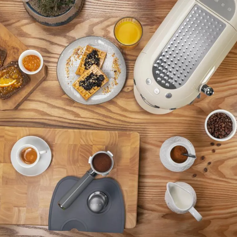 Tamper grå fra Smeg. Smegs kalibrerte kaffestamper er laget av rustfritt stål med en diameter på 51 mm og har et ergonomisk aluminiumshåndtak som gir et godt grep. Den er ideell for å presse kaffen til riktig punkt, og er spesielt kompatibel med ECF01-filterholderen, noe som gjør den perfekt for presis kaffeekstraksjon.