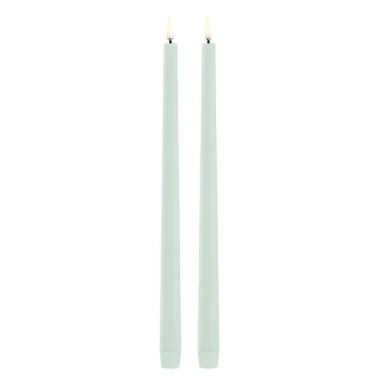 To stykk Taper Candles LED-kronelys i en lekker fargen dusty green fra Uyuni Lighting. Settet med de slanke kronelysene har en realistisk 3D-flamme som gir en autentisk følelse uten de typiske utfordringene ved vanlige stearinlys. Med disse lysene får du den varme atmosfæren fra levende lys, samtidig som de er laget av parafinvoks med LED-teknologi, noe som gjør dem tryggere å bruke innendørs. Den patenterte 3D-flammen er spesielt designet for å etterligne utseendet til ekte flammer, uten å skape farer som sot eller skadelige stoffer. Lysene er perfekte for hjem med små barn eller kjæledyr, da de ikke utgjør noen brannrisiko.