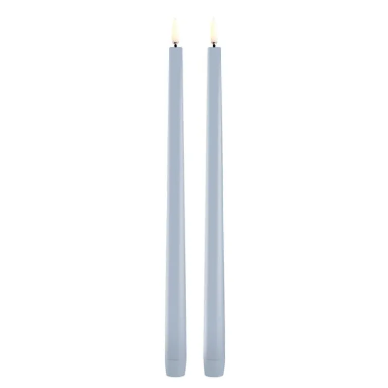 To stykk Taper Candles LED-kronelys i en lekker lys blå farge fra Uyuni Lighting. Settet med de slanke kronelysene har en realistisk 3D-flamme som gir en autentisk følelse uten de typiske utfordringene ved vanlige stearinlys. Med disse lysene får du den varme atmosfæren fra levende lys, samtidig som de er laget av parafinvoks med LED-teknologi, noe som gjør dem tryggere å bruke innendørs. Den patenterte 3D-flammen er spesielt designet for å etterligne utseendet til ekte flammer, uten å skape farer som sot eller skadelige stoffer. Lysene er perfekte for hjem med små barn eller kjæledyr, da de ikke utgjør noen brannrisiko.