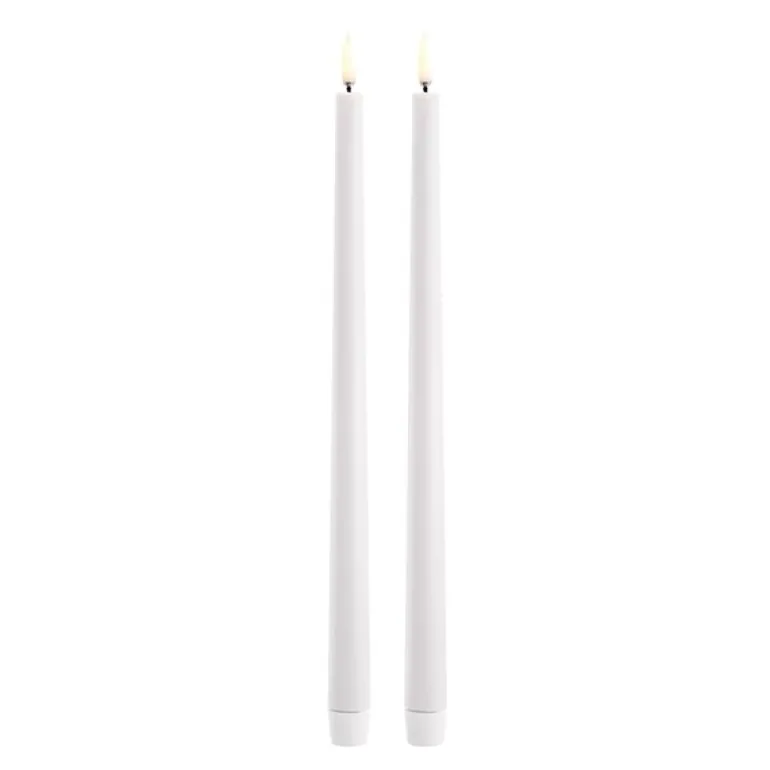 Uyuni Lighting Taper candles slim LED stearinlys 2,3×32 cm i nordisk hvit tilbyr en stilig og trygg løsning for stemningsbelysning. Med den innovative 3D-flammen får du en realistisk lyseffekt, samtidig som du unngår sot og andre skadelige stoffer som kan påvirke inneklimaet. Lysene er laget av parafinvoks, som gir en autentisk følelse som fremhever innredningen din.