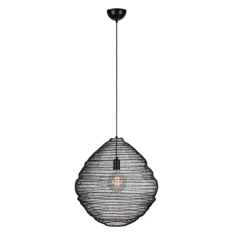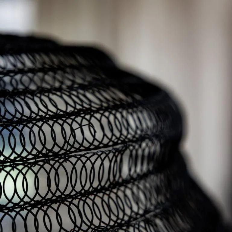 Tazza taklampe 50 cm fra Markslöjd i svart er en unik lampe i svart metall, med en form inspirert av naturens bikuber. Den organiske, rustikke formen gir lampen et dynamisk og skulpturelt utseende, perfekt for å tilføre rommet en spennende visuell dimensjon. Den åpne strukturen gir også interessante lyseffekter som skaper en unik atmosfære.