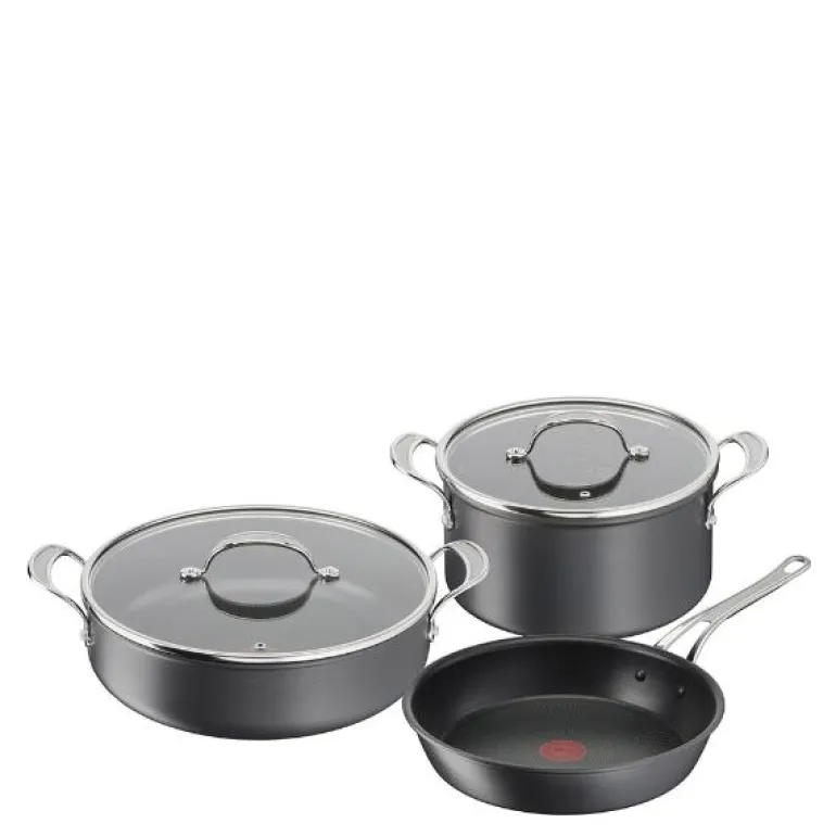 Hele settet er laget av anodisert aluminium, et materiale som både gir jevn varmefordeling og lang holdbarhet. Alle deler har et non-stick belegg som gjør at matlagingen blir enklere og rengjøringen mindre tidkrevende. Takket være Tefals ThermoSpot-teknologi, en rød indikator i midten av stekepannen og grytene, kan du lett se når overflaten har nådd optimal temperatur for matlaging. Settet er kompatibelt med alle typer komfyrer, inkludert induksjon, og kan brukes i ovnen opptil 210 °C, mens de tilhørende glasslokkene tåler opptil 175 °C.