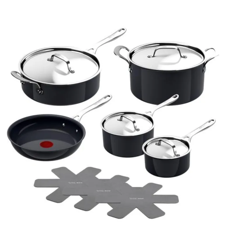 Tefal Enjoy grytesett 9 deler består av stekepanne 24 cm, Sautépanne 26 cm, Sausekjele 16+20 cm, Gryte 24 cm, 4 lokk, 1 beskyttelse.