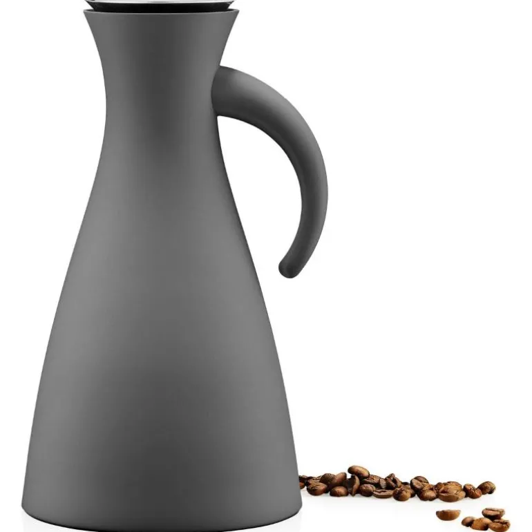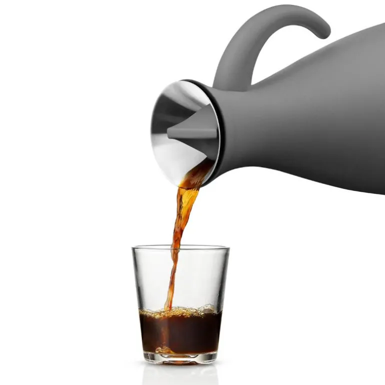 Termokannen fra Eva Solo i matt grå er 100 % dryppfri. Den elegante termokannen har en patentert hellekant i rustfritt stål, som heller varm kaffe og te i koppen – uten å søle en dråpe.