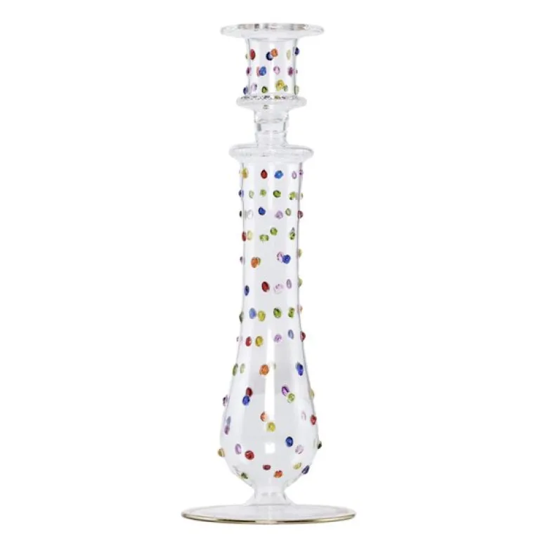 The Dots lysestake 26 cm multi fra Moonlight Copenhagen er et sjarmerende og unikt tilskudd til enhver interiørstil, perfekt for å skape stemningsfulle øyeblikk. Denne lysestaken, laget av munnblåst glass med en kombinasjon av flere farger, tilfører et lekent og elegant preg til hjemmet. Hvert eksemplar er 100 % håndlaget ved hjelp av spesielle teknikker, noe som betyr at små variasjoner i form og farge gjør hver lysestake helt unik. Lysestaken er designet for kronelys og kan brukes alene som et blikkfang, eller kombineres med andre lysestaker for en mer dynamisk og personlig stil. Moonlight Copenhagen legger stor vekt på kvalitet og tradisjonelt håndverk, og med The Dots lysestake får du et interiørelement som bærer preg av kjærlighet og lidenskap for detaljene. Denne vakre lysestaken skaper en innbydende atmosfære, enten den står på spisebordet, i vinduskarmen eller som en del av et dekorativt arrangement i stuen.