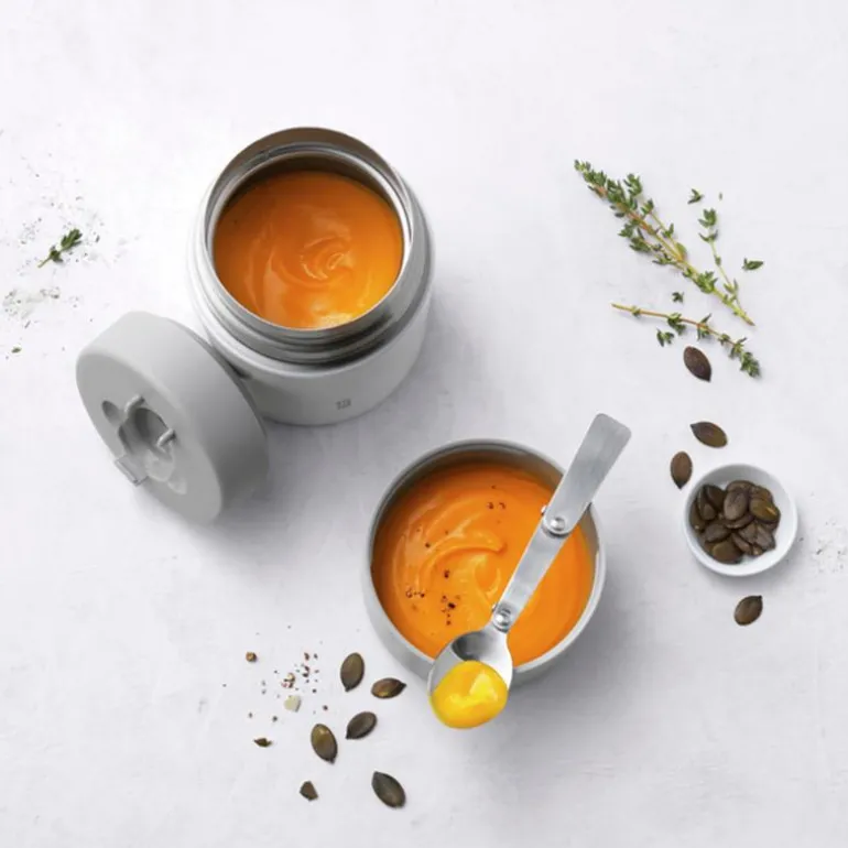 Hvit og sølvfarget mattermos, Thermo 70 cl med skje, fra Zwilling. Et perfekt alternativ når du vil ha med deg en egen lunsj – til jobben, på turen eller til parken. Denne rommer 7 dl og mulighetene er uendelige. Ta med en varmende suppe, en sprø salat eller en god pasta. Varm mat holdes oppvarmet i opptil 8 timer, og kald mat kald i opptil 11 timer.