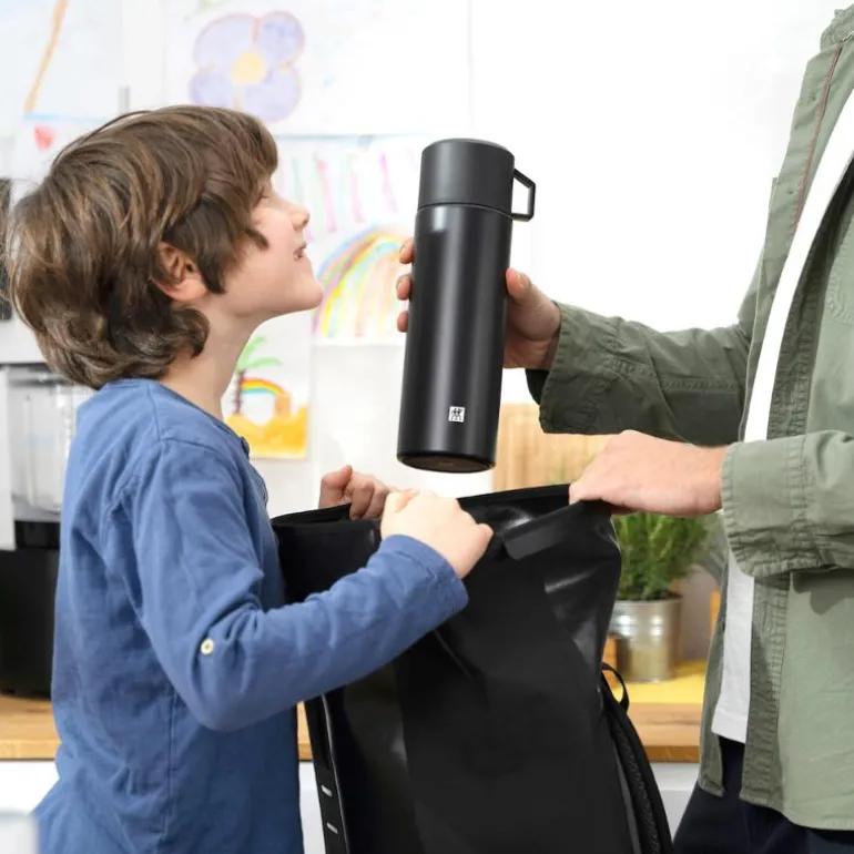 Enkel og fin termos i svart, Thermo 1 liter, fra Zwilling. Dette er en termos for alle anledninger. Ta den med for en kaffepause i skogen, til lekeplassen eller en parkbenk med vakker utsikt. En kopp kaffe, te eller varm kakao smaker ekstra godt utendørs, og med Thermo termos holder varme drikker varmen i opptil 18 timer. Perfekt for en lengre reise når man vil slippe å kjøpe kaffe.