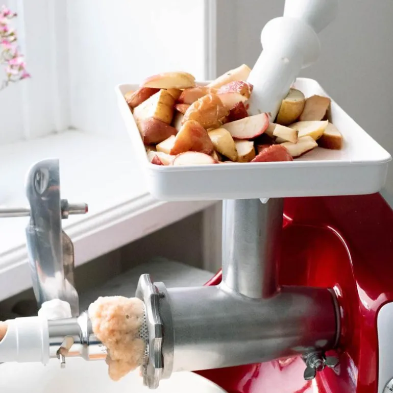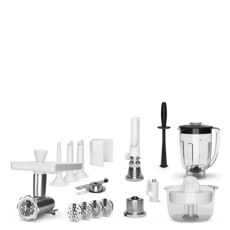Den store tilbehørspakken til Ankarsrum Assistent leveres med kjøttkvern, blender, sprutdeksel, 3 pølsehorn, matebord, purepresse, rivjern og 4 hulleskiver (2,5mm, 4,5mm, 6mm og 8mm), citruspresse og kakesprøyte. Med denne pakken får du dekket alle behov i kjøkkenet. Nå kan du kna, rive, raspe, mikse, vispe, røre, presse og kverne!