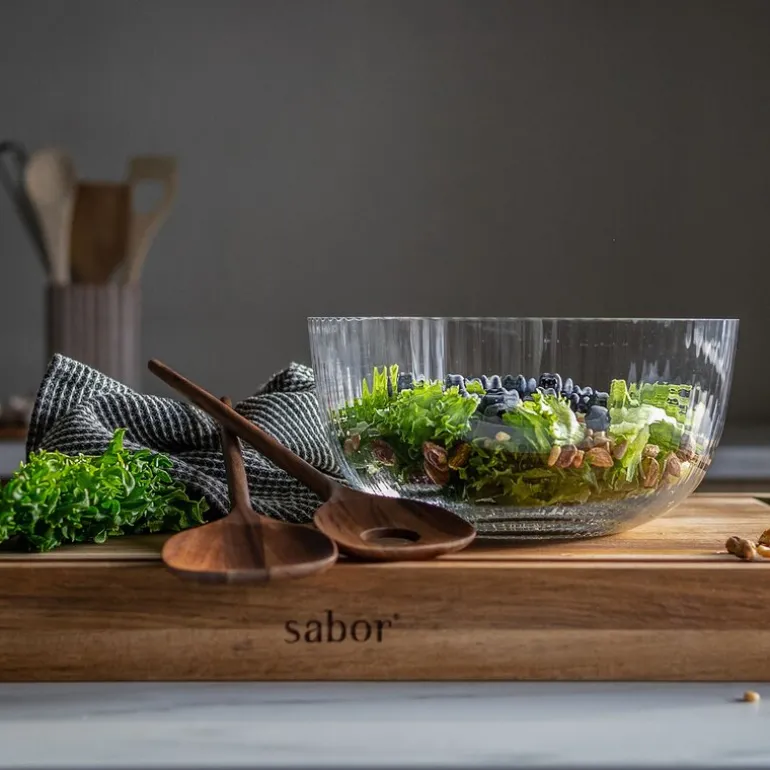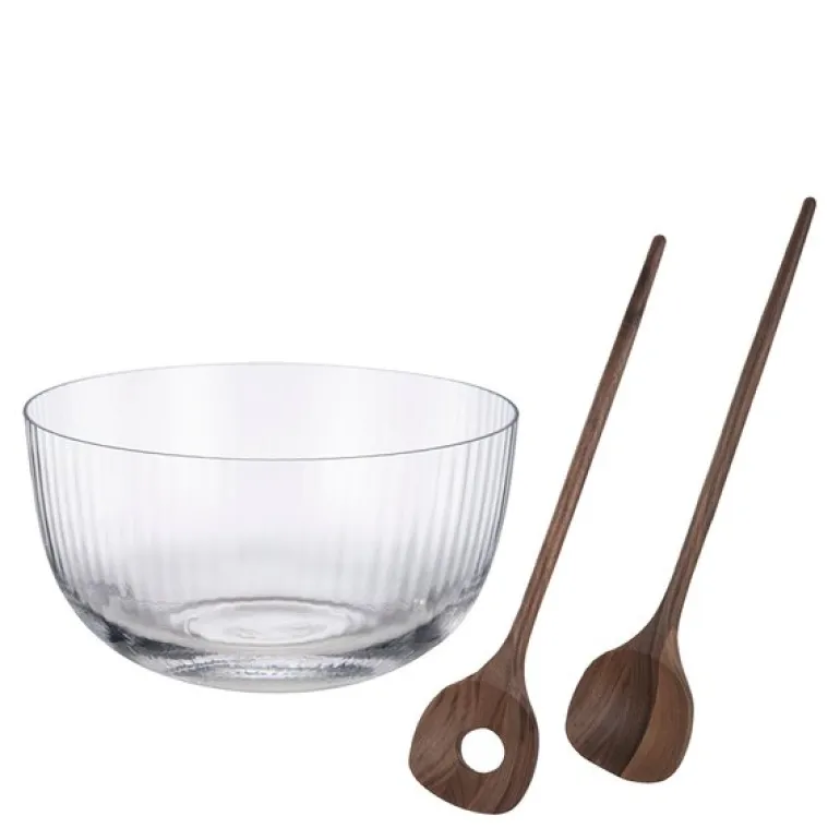 Salatbollen inkluderer salatbestikk i blanklakkert valnøtt.