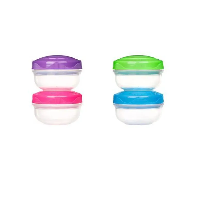 Boksene kan stables, så de er lette å oppbevare. Skrulokkene er helt tette slik at maten holder seg frisk lenge, og du unngår søl i vesken. De tåler også oppvaskmaskin og fryser. Tar du av lokken tåler boksene også mikrobølgeovn.