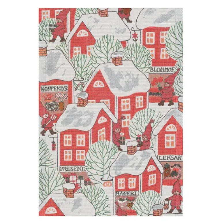 Tomtebyn håndkle 35×50 cm rød fra Ekelund er et sjarmerende og dekorativt håndkle som tilfører hjemmet et koselig og tradisjonelt preg. Med sitt detaljerte nissemotiv i dyp rød farge, skaper dette håndkleet en varm og innbydende atmosfære som passer perfekt til jul og vinterens høytider.