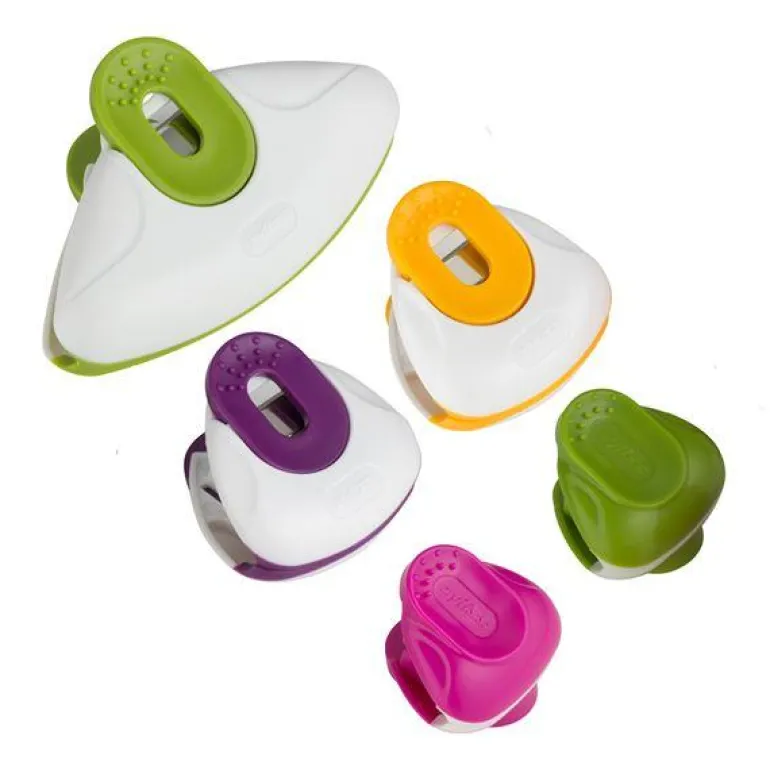 Sett med 5 stk poseklips med ergonomisk flerbruksdesign, fra Zyliss. Poseklipsene er ideelle til forsegling av poser eller for å holde oppskrifter, memoer og notater. Med sin enkle åpne lukkefunksjon er den enkel å håndtere både for store og små. Med magnet på baksiden kan en henge huskelapper på kjøleskapet. Dette lille redskapet, er til stor hjelp på kjøkkenet.